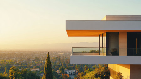 A modern architectural structure with a cantilevered balcony, overlooking a scenic urban landscape.