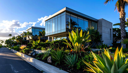 A contemporary home showcases a breathtaking sunset over the ocean with lush greenery