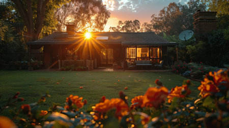 The sun is setting behind a house in the backyard, casting a warm glow over the scene.