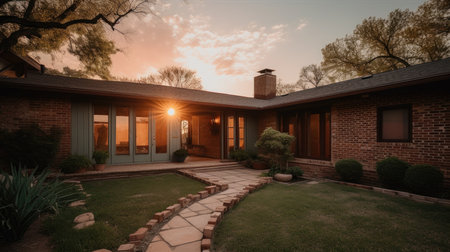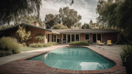Home architecture design in Mid-Century Style with Angular rooflines constructed by Wood and Glass material. Atomic Ranch style. Generative AI AIG25 .