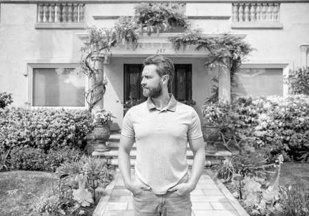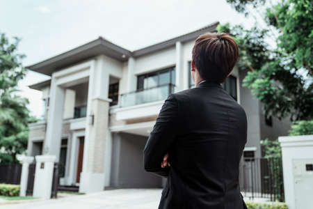Portrait of asian successful businessman with a big house at background. Rich guy with gigantic house.