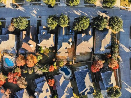 Aerial view close-up roof shingles of new development townhouse near historic Old Town Coppell, Texas, USA. Upscale cottage style homes in suburbs Dallas covered porch patio, no backyard