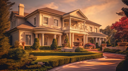 Warm Sunset Glow on a Traditional American Home: Picturesque Colonial Architecture in Professional Photo with Copy Space. Concept Colonial Architecture, Sunset Glow, American Home