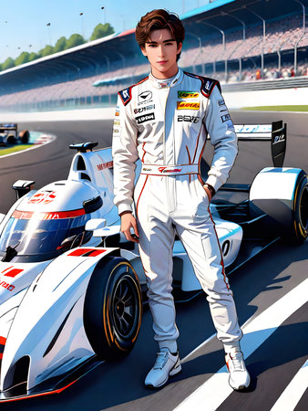 illustration, a man in a white outfit standing next to Formula racing car. ai generative