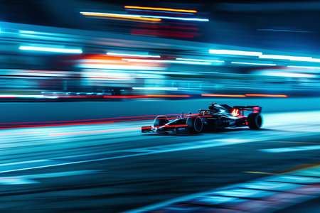 A high-speed formula race car blurs past with neon lights trailing at a racing circuit