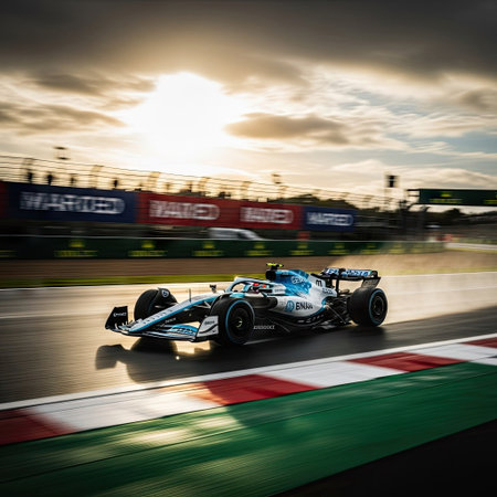 A Photo realistic image of Formula 1 car on racetrack at sunset, showcasing its sleek design and powerful stance