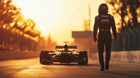 Early morning light shines on a Formula One pilot walking toward his car, a symbol of beginnings and ambition. Copy space