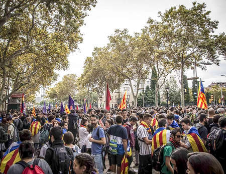 BARCELONA, SPAIN - SEPTEMBER 11, 2018: Hundreds of thousands of Catalans call for independence from Spain on the National Day of Catalonia.