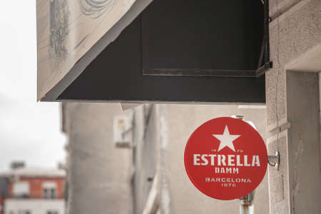 BELGRADE, SERBIA - MAY 3, 2020: Estrella Damm logo in front of a local retailer bar in Belgrade.