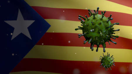 3D illustration Catalonia independent flag waving and Coronavirus 2019 nCov concept. Asian outbreak in Catalan estelada, coronaviruses influenza as dangerous flu strain cases as a pandemic. Covid 19
