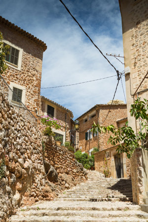 View of a medieval street in the Old Town of the picturesque Spanish-style village Fornalutx, Majorca or Mallorca island