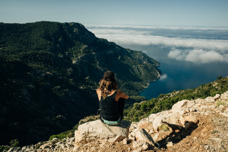 Hiking on Lycian way. Woman with backpack is trekking in beautiful nature. High quality photo