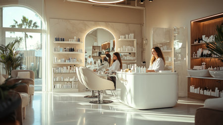 Experience the beauty of a modern salon interior, featuring minimalist design, comfortable seating, and an airy atmosphere filled with natural light and greenery.