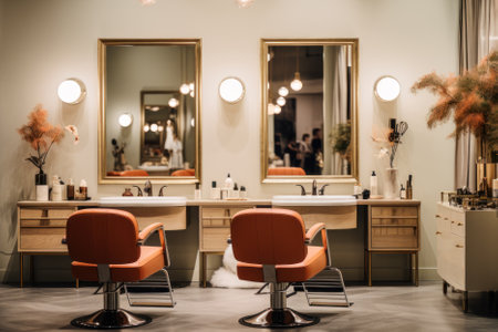 Stylish hair salon interior with chic decor and plush seating, copy space.