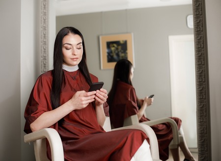 Carefree female in protective gown is sitting in chair back to large mirror. She is spending time in salon and holding smartphone while looking at screen
