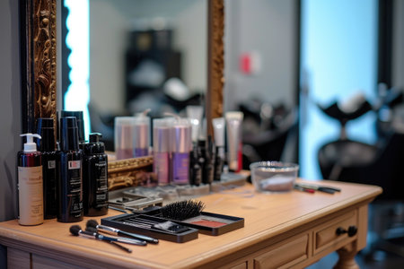 A wooden table covered with a mirror and an abundant collection of cosmetics for personal care and makeup, A hairdresser's workstation with mirror and hairstyling tools, AI Generated