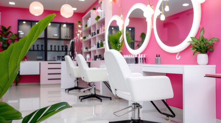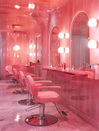A visually striking salon interior featuring vivid pink walls, stylish mirrors, and modern furniture, ideal for beauty and hairstyling photography.