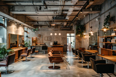 The hair salon features sleek chairs, wooden accents, and greenery, creating a tranquil environment for hairstyling and grooming in a contemporary urban space.