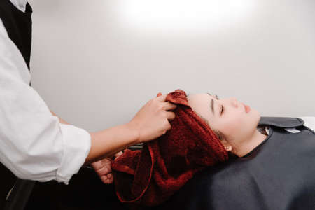 Hair salon concept a male hairdresser using an auburn towel covering a female client’s hair after hair wash