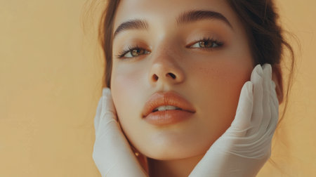 Beauty treatment for young beautiful female face, doctor's hand in gloves touch face of woman isolated on white. Skin care, beautician treatments, body wax, mink eyelashe, eyebrow grooming, permanent