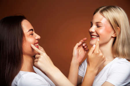 two pretty diverse girls happy posing together: blond and brunette, caucasian and asian on brown background, lifestyle people concept