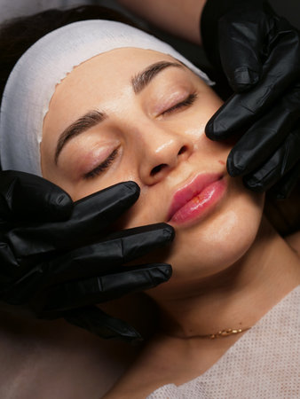 Close-up of hands of cosmetologist woman in black gloves making special face massage to young pretty Caucasian smiling woman lying on couch in beauty salon with eyes closed.