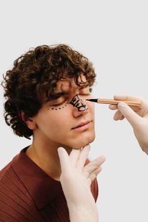 Male rhinoplasty and blepharoplasty markup close up. Process of preparation for eyelid surgery