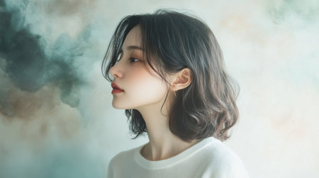 A young woman poses gracefully in profile, showcasing her soft features and wavy hair. The backdrop features a blend of muted colors, creating an ethereal atmosphere.