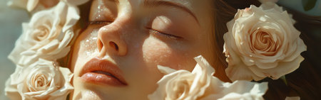A woman rests peacefully with her eyes closed, surrounded by soft roses. Her face glows gently, revealing tranquility and beauty in a serene natural setting.