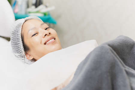 Smiling of beautiful woman with clean healthy skin relaxing lying in spa salon.