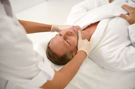 Overhead view of an unrecognizable aesthetician performing a facial lifting smoothing anti-aging professional massage of mature man's face. Skin care and male beauty procedures concept at wellness spa