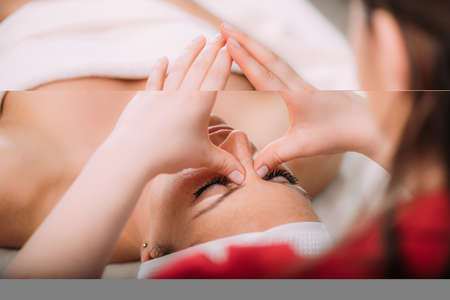 Beautiful woman receiving facial massage in a beauty salon. Her eyes closed. head and shoulders. Hand pinching her face. Diagonal framing.