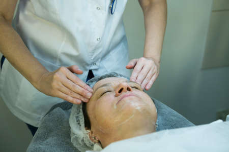 Closeup portrait of a woman in spa salon getting face treatment. Facial skin treatment. Rejuvenation treatment.