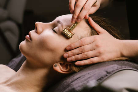 Side image of a woman receiving temple massage in a beauty salon. Her eyes closed. She's lying on a massage bed, enjoying the sensation. Hands massaging her forehead with a tipped roller.