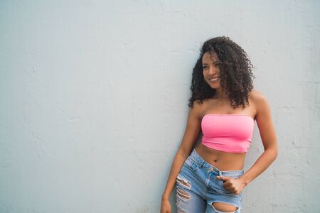Portrait of young afro american woman looking confident and posing against grey background.