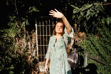 Beautiful brunette girl in green dress posing in sunny turkish streets and parks near by green tree.
