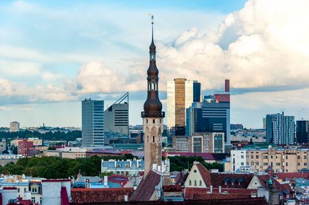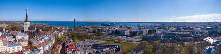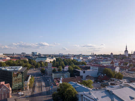 Aerial view of the Tallinn old town on a sunny summer day. Panoramic cityscape. Travel guide, sightseeing, culture and religion theme. Estonia