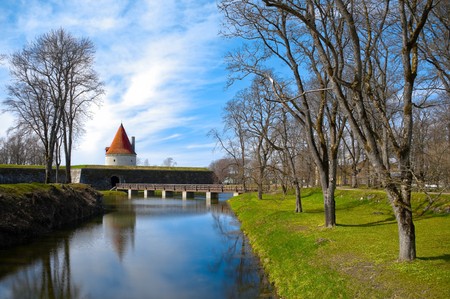 Kuressaare castle tower with blue sky in background and water with reflections in foreground (Saarema, Estonia)