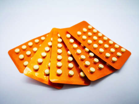 Emergency contraceptive pills in blister pack isolated on white background. Morning after pills. Cause of ectopic pregnancy. Emergency contraception for prevent pregnancy after unprotected sex.