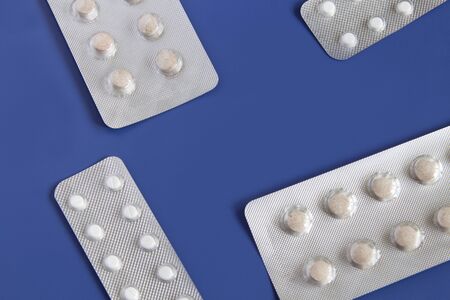 Pills in a blister pack close-up on a blue background.Health and medicine.Pills packing.Medical concept.copyspace for text