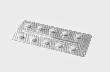 Closeup of pharmaceutical blister pack with ten pills isolated on white. Photorealistic 3d illustration