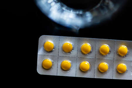 Blister package with fish oil capsules on color background. Medicine pills on a light background. Medicines and prescription pills flat lay background. Yellow medical tablets in blister.
