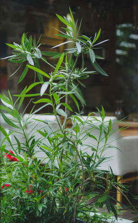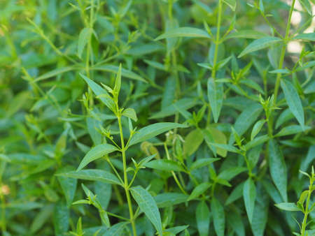Vertical photo of Aloysia citrodora, lemon beebrush, lemon verbena growing on the balcony in a pot. Selective focus and natural light photo