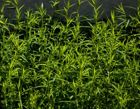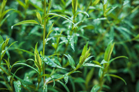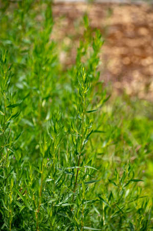 Tarragon or Estragon green leaves growing from the soil in the garden. Medicinal and food plant Artemisia or wormwood for lemonade drinks and cooking. Local food gardening, eco organic fresh herbs.