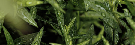 Greenery texture from leaves. Green bright wet surface with water droplets. Branch, leaf of a tree or bush after rain. Close-up. Selective focus.