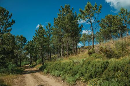 Dirt road passing through hilly terrain covered by bushes and trees, in a sunny day at the highlands of Serra da Estrela. The highest mountain range in continental Portugal, with astonishing scenery.