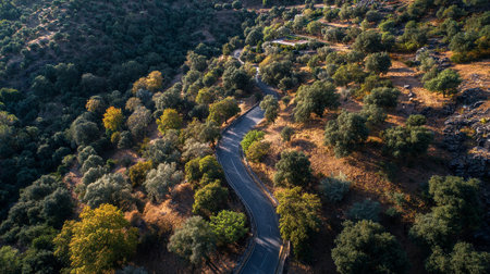 Winding Road Through Hillside Forest with Autumnal Tints from an Aerial Perspective