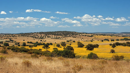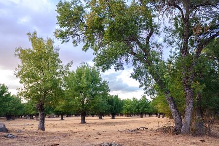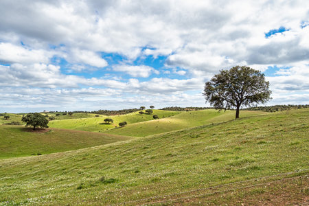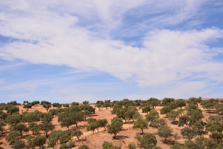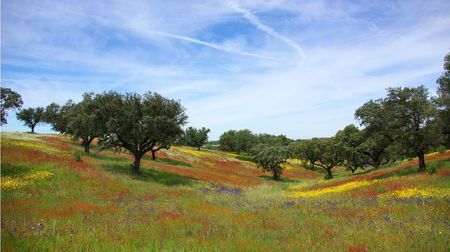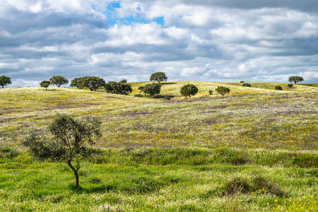 Springtime in Alentejo, Portugal. Cork oak forest landscape near Evora.