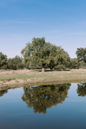 Beautiful scenery of the banks of a river with oak trees reflected in water