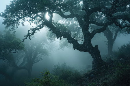 A foggy atmosphere engulfs a densely packed forest, emphasizing the abundance of tall, leafy trees, Dense fog covering an ancient woodland, AI Generated